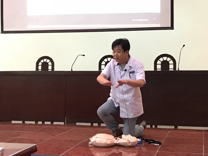 “如果遇到有人心跳骤停和意识丧失,我们要怎么判断?怎么处理?县急救中心专家 易先斌首先通过PPT一步步给大家讲述了心跳骤停引起的原因、如何判断、心肺复苏如何操作等等,并现场手把手教大家在遇紧急情况时如何给病人进行心肺复苏术。